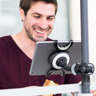 Le TabletTail : un outil universel qui se clipse à n’importe quelle surface pour maintenir votre tablette. Il peut être fixé à des trépieds, des pupitres de musique et d’autres surfaces similaires.