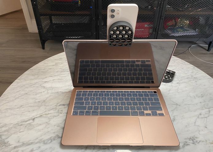 _support Mac iPhone Continuity Camera_ : un support iPhone MagSafe compatible imprimé en 3D en PLA. Il s’accroche à l’arrière de votre Mac et sécurise votre téléphone. Il est compatible avec iMac 24″, iMac Pro, MacBook Air M1 et MacBook Pro M1 pour le moment (via Github).