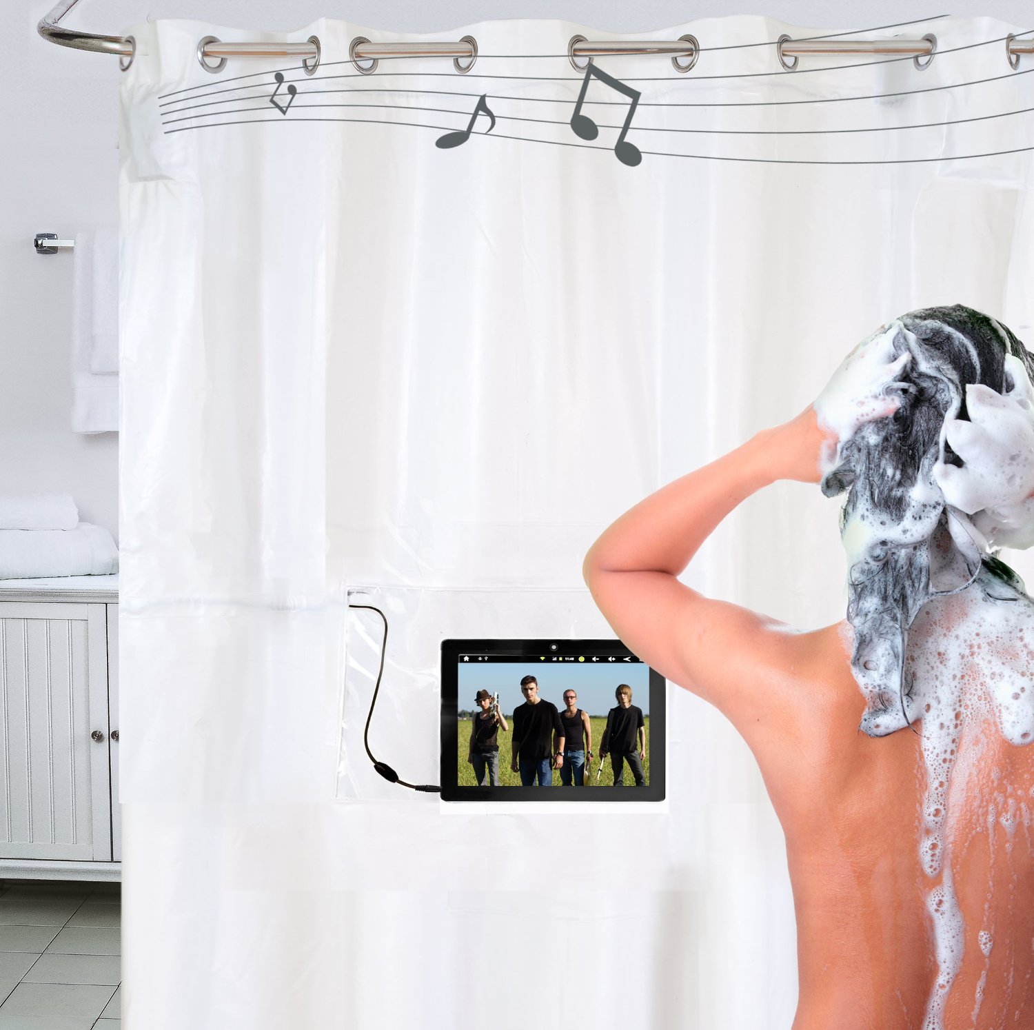 Shower Tunes : cet étui imperméable et sensible au toucher contient votre tablette en sécurité et dispose d’un haut-parleur imperméable intégré, vous permettant d’écouter de la musique, de répondre à des appels et de faire bien plus encore.