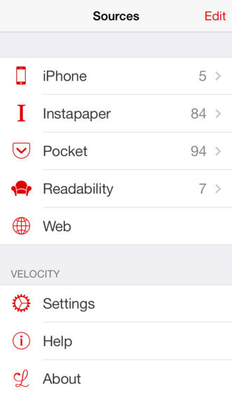 Velocity : cette application vous aide à lire plus rapidement que Before en utilisant vos articles Instapaper, Readability et Pocket. Elle dispose de 3 thèmes et de plusieurs tailles de texte. L’application est optimisée pour iOS 7.