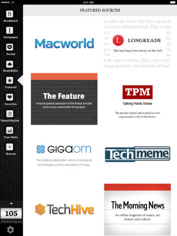 Outread : conçu pour iOS 7, il dispose d’une synchronisation en arrière-plan, de plusieurs tailles de police et d’une intégration AirDrop. Il synchronise avec Instapaper, Pocket et Readability et prend en charge la lecture hors ligne. Il dispose de deux modes de lecture, de deux thèmes et de 5 polices.