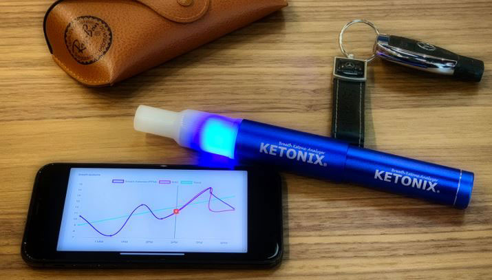 KETONIX Bluetooth : un compteur de cétones intelligent qui indique votre production de cétones en analysant votre souffle. Ce dispositif auto-étalonnage est compatible avec les appareils iOS, Android et macOS.