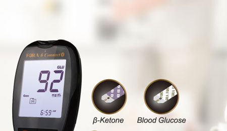 Fore 6 Connect Meter : un kit de test de glucose sanguin avec un dispositif de piqure indolore. Le dispositif se transforme automatiquement en un compteur de cétones avec les bonnes bandes de test. L’application iFORA HM est disponible pour les appareils iOS et Android.
