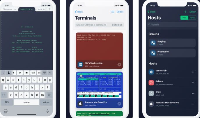 Termius : une application de ligne de commande pour iPhone qui prend en charge les sessions SSH, Mosh et Telnet. Elle prend en charge les claviers Bluetooth. Avec un abonnement payant, vous obtenez la fonction de synchronisation avec un chiffrement AES 256 bits. Elle débloque également la fonction d’autocomplétion.