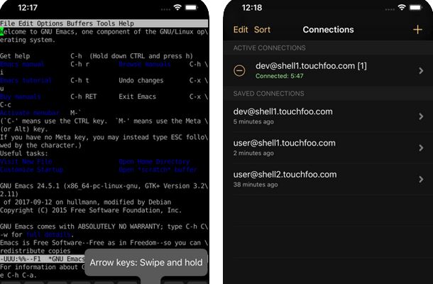 Blink Shell : un client Mosh et SSH qui vous fournit une connexion persistante et stable. Il prend en charge les claviers Bluetooth. Vous pouvez utiliser le geste de balayage pour passer entre vos connections ouvertes. De nombreuses commandes UNIX sont prises en charge.