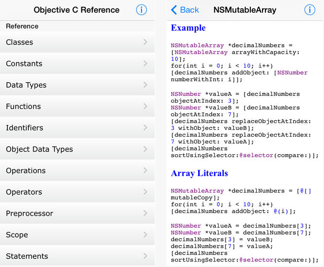 Objective C Reference : sert de référence pour Objective C. Aucune connexion internet n’est requise pour accéder aux matériaux. Il couvre les classes, les constantes et d’autres sujets pertinents.