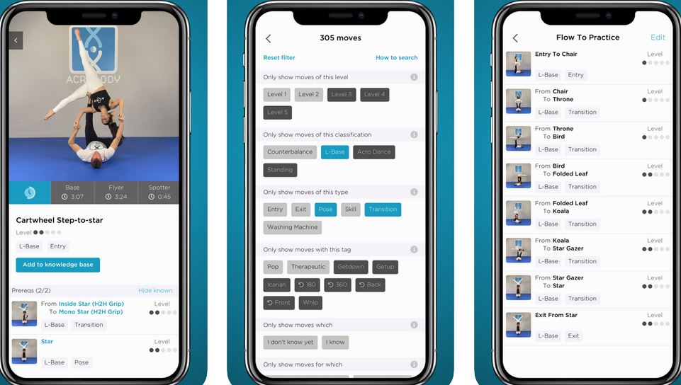 AcroBody : cette application iOS vous enseigne l’acrobatie et le yoga acro avec des instructions vidéo étape par étape. Elle propose des tutoriels pour divers rôles de spotter et de flyer. Elle offre également des prérequis détaillés, vous permettant de savoir comment atteindre votre objectif.