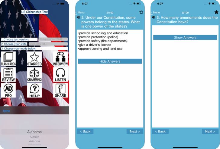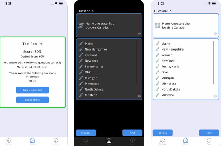 Test de citoyenneté avec audio : une autre application de test de citoyenneté américaine avec explication pour chaque question et audio. Elle comprend plus de 100 questions par état couvrant 9 sujets différents. Elle peut vous montrer des questions aléatoires, celles que vous avez répondues incorrectement ou celles que vous n’avez pas tentées.
