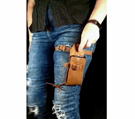L’étui pour cuisse iPhone de MyFunkyCamelot : un holster en cuir attractif avec une sangle de 30 pouces et un cordon pour rester en place autour de votre cuisse. Il vous permet de transporter votre téléphone sans avoir à le tenir.