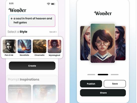 Wonder : une autre application iPhone qui utilise l’IA pour transformer les mots en art. Il suffit de saisir un prompt, de choisir votre style et le reste est facile. Plusieurs styles sont disponibles pour que vous puissiez choisir, notamment le stylo et l’encre et le cinématique.
