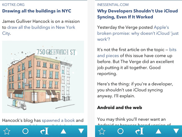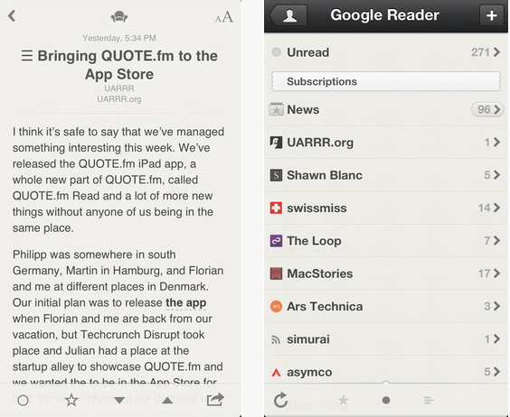 Reeder : qui était l’un des meilleurs clients Google Reader. Maintenant, il prend en charge Feedly, Feedbin, Feedwrangler et Fever. Il dispose également de nombreux services de partage, notamment Pocket, Evernote, Instapaper, Twitter, Bugger et Facebook.