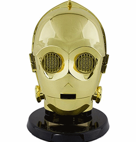 Enceinte Bluetooth C-3PO : une enceinte officiellement licenciée avec des yeux qui s’allument. Elle est portable et fonctionne sur des piles rechargeables.
