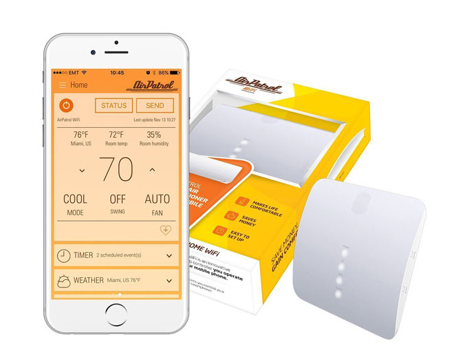 L’AirPatrol transforme votre air conditionné de fenêtre ou portatif en un appareil intelligent WiFi. Il est compatible avec les appareils iOS et Android, Alexa et IFTTT. Il est équipé de capteurs de température et d’humidité intégrés.