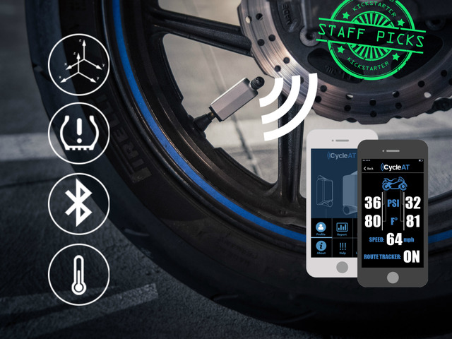 Le CycleAT : un capteur de pression de pneu Bluetooth pour les motocyclettes et les bicyclettes qui vous informe lorsque vous roulez avec une pression de pneu incorrecte. Il vous notify via des signaux audio et visuels.
