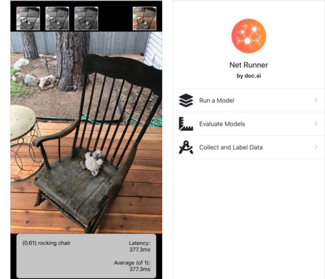 Nous avons également l’application Net Runner Net Runner : cette application vous permet d’exécuter des modèles d’apprentissage automatique de vision numérique sur votre téléphone. Vous pouvez le faire sur une photo ou une collection de photos entière. Vous serez également en mesure de mesurer la latence et la précision de vos modèles.