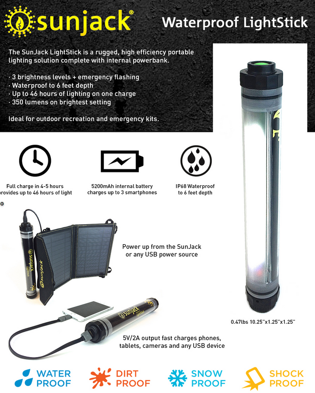 Le SunJack LightStick : un luminaire portable et robuste avec une banque d’alimentation. Il peut charger jusqu’à 3 smartphones et offre jusqu’à 46 heures d’éclairage.