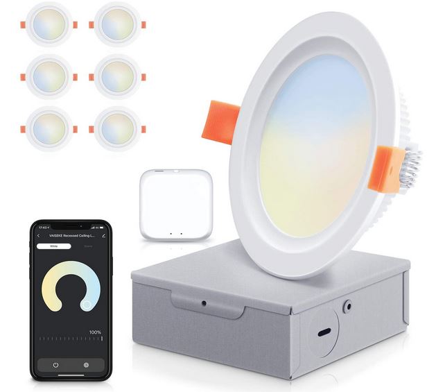 VAISEKE Smart LED Recessed Light : cette lumière intelligente à application a une température de couleur de 2700-6500K. Elle fonctionne avec Siri, Alexa et Google Home. Ces lumières de 4 pouces sont dimmables de 10 à 100%.