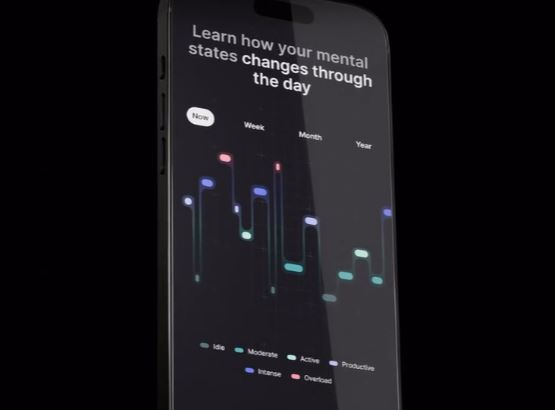 L’application complémentaire visualise vos 6 états cérébraux pour vous aider à comprendre vos lectures. Par exemple, vous saurez quand votre cerveau est actif, inactif ou surchargé. Vous pouvez utiliser ces informations pour prendre une pause ou déterminer quand vous pouvez vous concentrer profondément sur le travail. Vous pouvez également voir le casque sur cette autre image : .