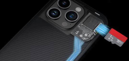La gamme iPhone 15 est plus puissante que jamais. Nous souhaitons tous avoir plus d’espace sur notre iPhone. L’étui iPhone 15 iRe5 Micro SD Card vise à répondre à ce problème. Il permet d’étendre la mémoire de votre téléphone de 256 Go, 512 Go ou 1 To. Vous pourrez utiliser l’étui pour stocker du contenu sans compromis. Vous pouvez trouver des produits similaires ici. Alors que nous avons présenté des disques SSD externes qui s’attachent magnétiquement à l’arrière des iPhones, cette solution semble plus élégante. Elle vous offre beaucoup plus d’espace pour enregistrer des vidéos. Cet étui carte Micro SD fera bientôt ses débuts sur Kickstarter. Vous pouvez suivre le projet ici. L’étui est présenté dans l’image suivante :