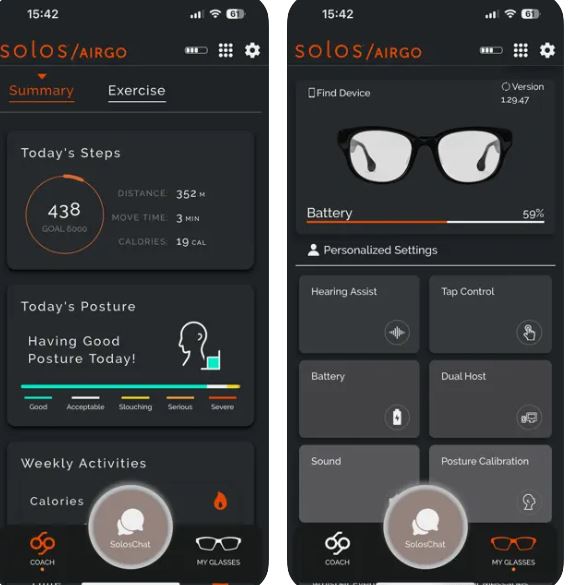 Ces lunettes disposent d’un capteur tactile sur les branches et d’un bouton virtuel. Grâce à leur SmartHinge, vous pouvez essayer différents montures. Les Xeon 5S ont une conception étanche aux éclaboussures. La batterie dure jusqu’à 7 heures pour les appels. L’application mobile AirGo vous donne accès à SolosChat, SolosTranslate et SolosMessage. Vous pouvez également l’utiliser pour des exercices de base. Cet appareil utilise la technologie Whisper Audio pour la suppression de bruit jusqu’à 45dB.