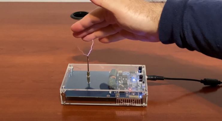 En mode régulier, vous pouvez interagir avec cette bobine de Tesla en utilisant des tubes à gaz et d’autres accessoires amusants. En mode musique, vous devrez jouer de la musique à onde carrée à partir de votre smartphone. Vous pouvez toujours placer un verre sur l’aiguille de décharge pour transformer cela en une lampe à plasma.