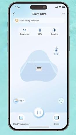 Ce robot est équipé de 7 moteurs pour se déplacer dans votre piscine. Il utilise un capteur sous-marin pour la détection des bords et des coins. Vous pouvez utiliser votre téléphone pour ajuster la vitesse, surveiller la température de l’eau et contrôler la navigation. L’iSkim Ultra dispose d’un total de 20 capteurs. Il dispose également d’une charge solaire de 24W.