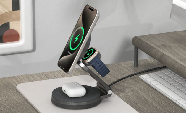 Nous avons tous plusieurs appareils Apple qui nécessitent une recharge quotidienne. L’ADAM elements Mag 360 est un chargeur de voyage pliable qui peut charger votre iPhone 15, votre Apple Watch et vos AirPods. Avec le support Qi2, le temps de charge est réduit de 60 % pour votre iPhone 15. Vous pouvez voir comment cela fonctionne dans l’image suivante :