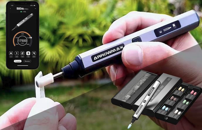 Rencontrez le SGS PRO : un stylo intelligent de polissage et de gravure connecté que vous pouvez utiliser sur du verre, du bois, de l’or, du PLA, des pierres, de l’acier et des cristaux. Il dispose d’un mode intelligent pour vous aider à choisir le meilleur couple, les tours/minute et les réglages pour chaque tâche. Vous pouvez également utiliser l’application ARROWMAX pour iOS ou Android pour personnaliser la vitesse et la direction.